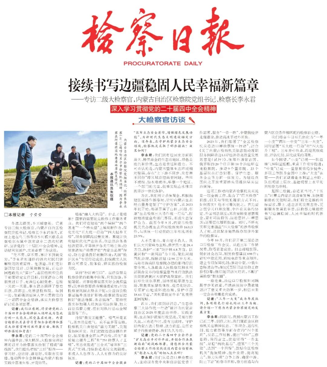 2023年,我们部署了“全区检察机关沿边口岸检察统一行动”,出台《关于内蒙古检察机关依法能动履职服务保障沿边口岸经济带高质量发展的意见(试行)》,统筹外通蒙古国、俄罗斯的20个口岸和10个沿边所在地检察院,推动9个盟市院、23个基层院在打击犯罪、保护生态、服务企业等方面一体发力,为建设我国向北开放重要桥头堡提供坚实法治保障。